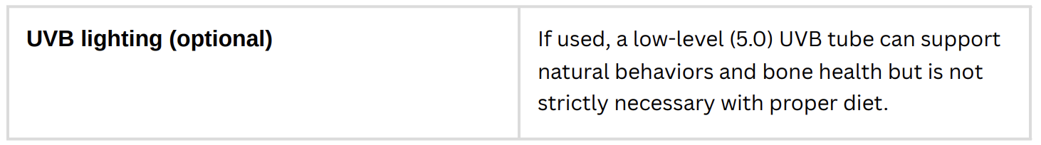 Lighting is not required, but a natural day-night light cycle is recommended. Low-intensity UVB can be used but is not essential.